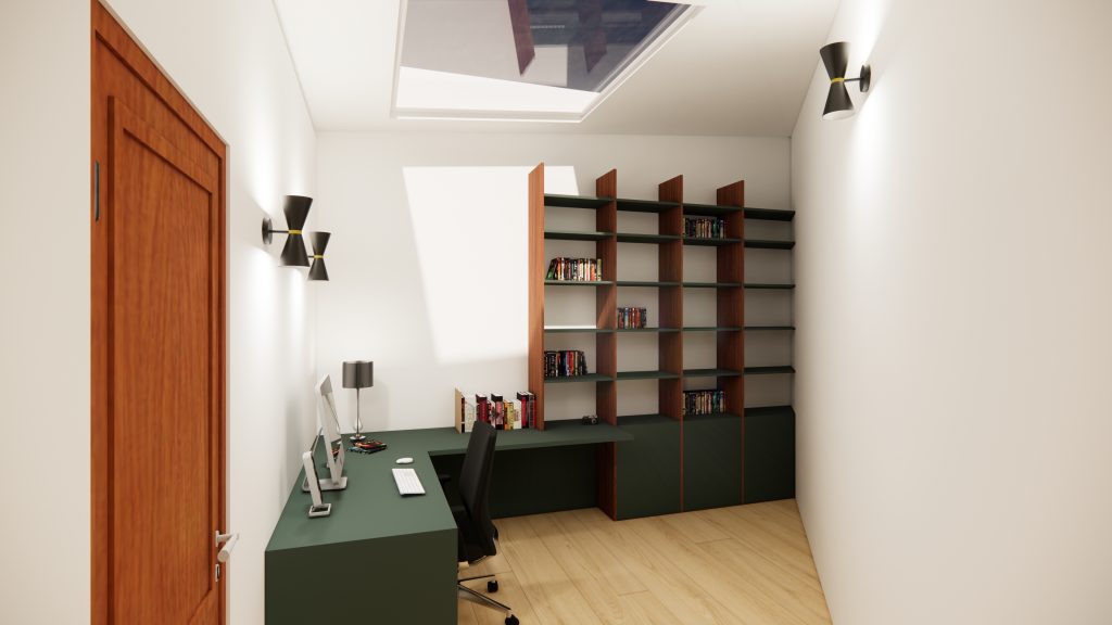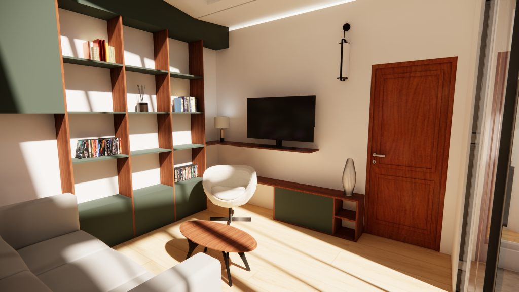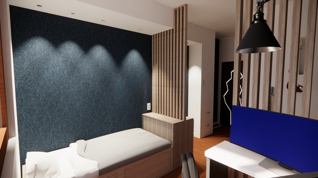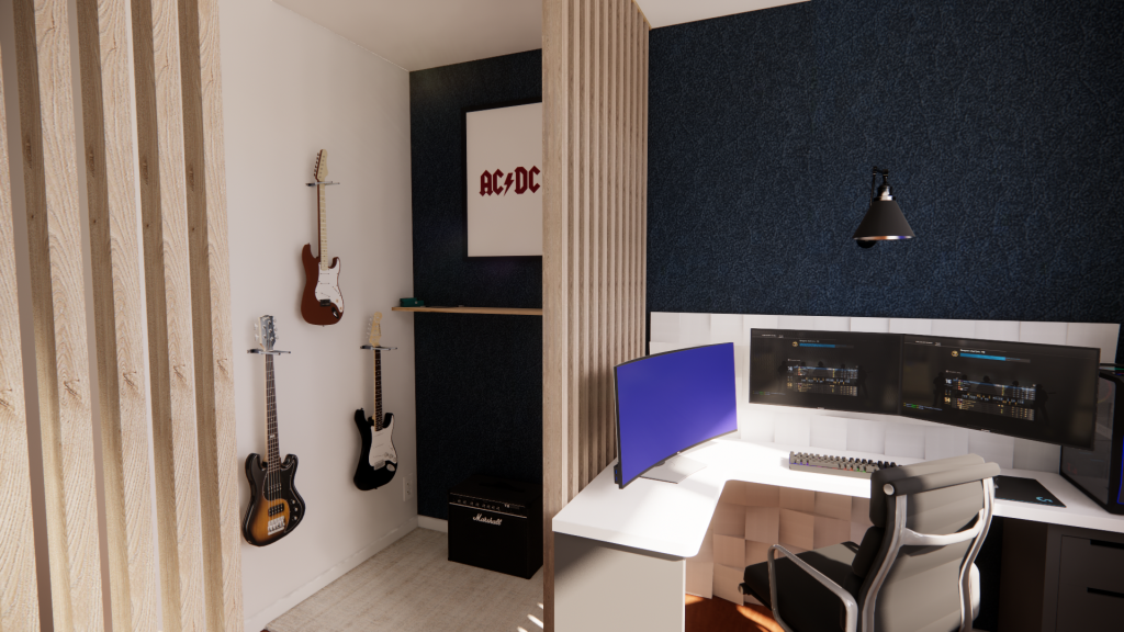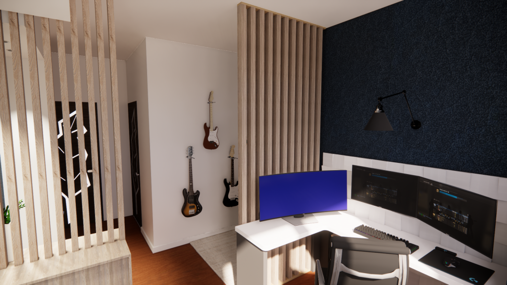 Ici, le client est un étudiant d’une vingtaine d’année qui fait des études dans l’informatique en alternance, qui alterne donc entre entreprise et école, et a comme passion la guitare, notamment électrique. Dans cet aménagement, je vais jouer avec la lumière pour faire en sorte d’avoir le plus d’apport possible, tout en délimitant les différents espaces.