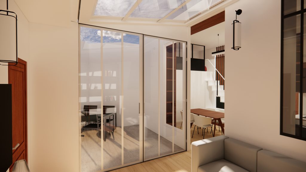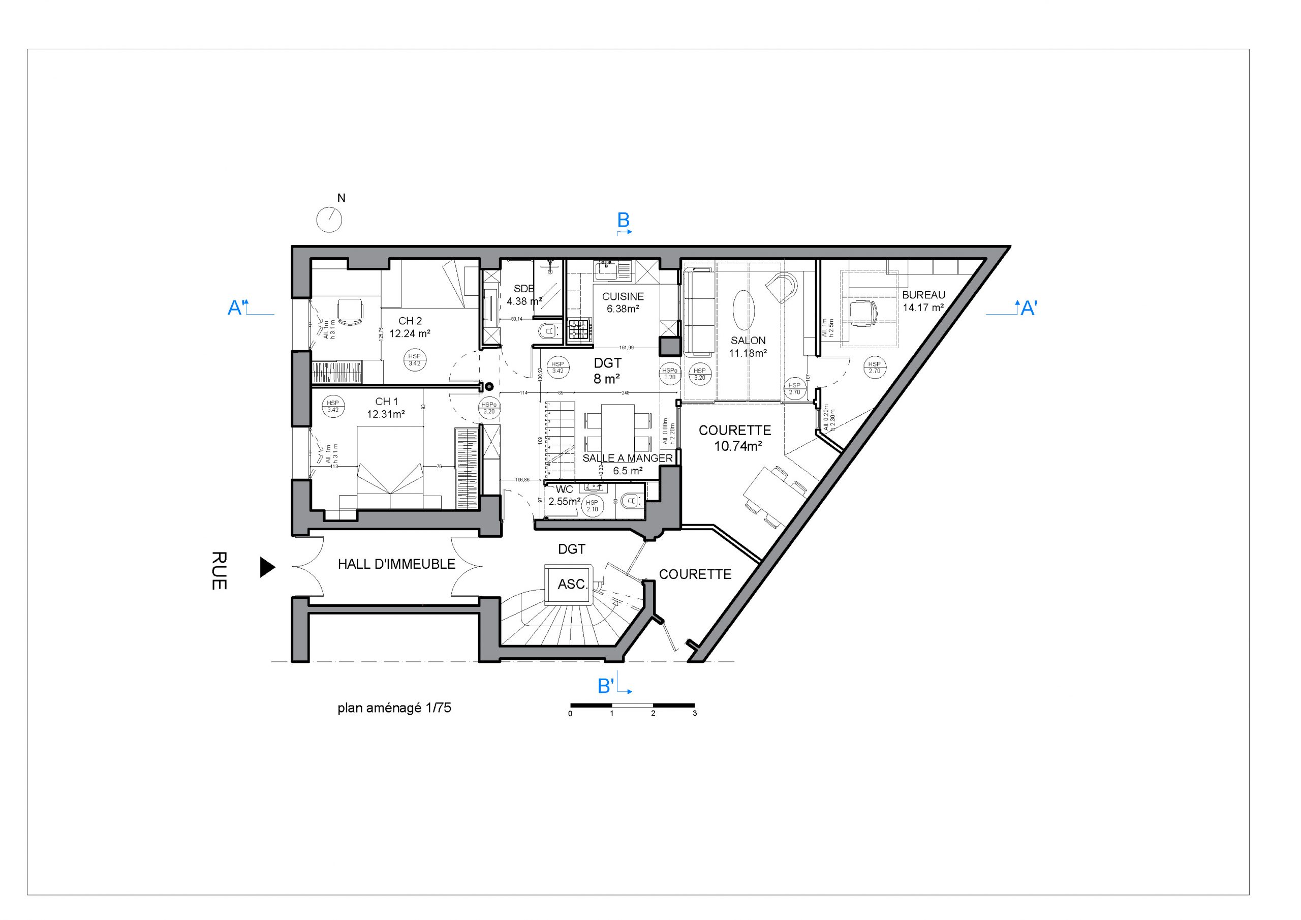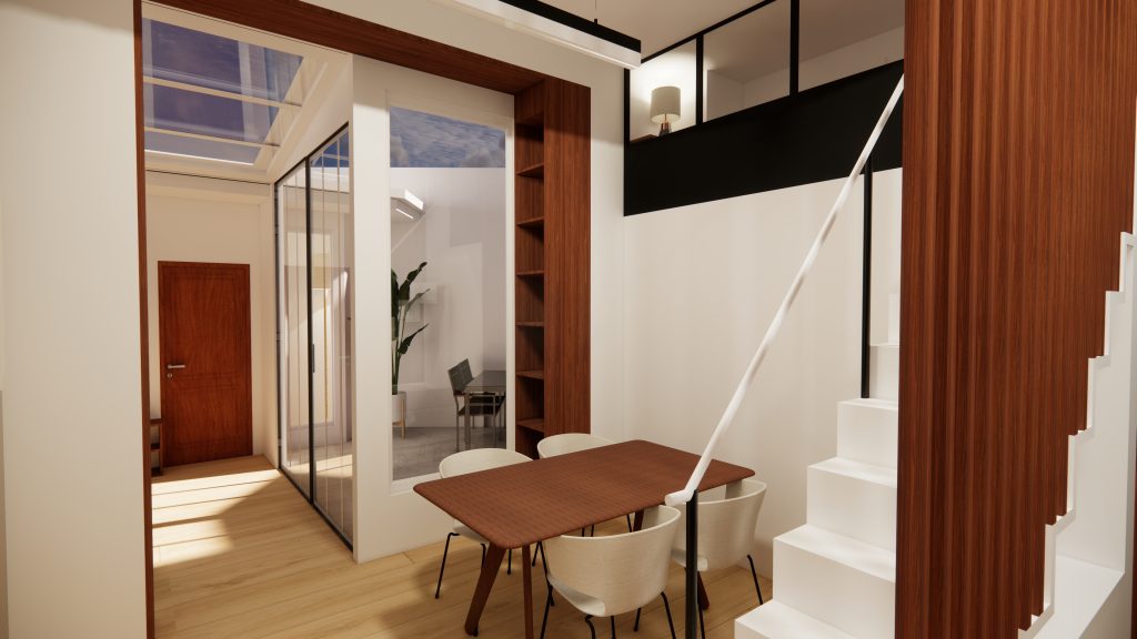 Ce projet a pour but de restructurer plusieurs lots d’appartements qui se trouvent en rez-de-chaussée en un seul appartement qui comporte un bureau et un travail sur l’interstice avec un espace cour, selon un profil client personnalisé.