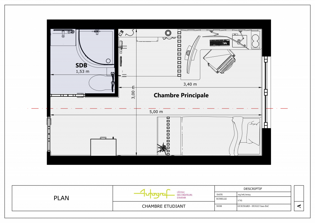 Le projet a pour but de concevoir l’aménagement intérieur d’une chambre d’étudiant, en proposant un aménagement de l’espace, avec du mobilier correspondant aux fonctions : dormir, travailler, manger. Cet aménagement s’est fait à partir d’un profil que j’ai créé.